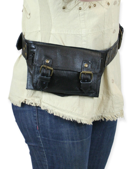 The adjustable leather belt features two rows of grommets and front and back belt buckles. Other than the pouch zippers, all metal fittings are finished with an antiqued brass patina. Note, this accessory will not slide through belt loops.