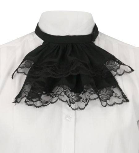 First of all I found this poor value and quality. Secondly, I thought that I was buying a blouse with a jabot --if you look at the picture, that is what one sees! I did think it inexpensive for a blouse - but I think that 30 whatever dollars is ridiculously expensive for a piece of unfinished lace with a small cheap brooch attached. I will certainly not use your services again.